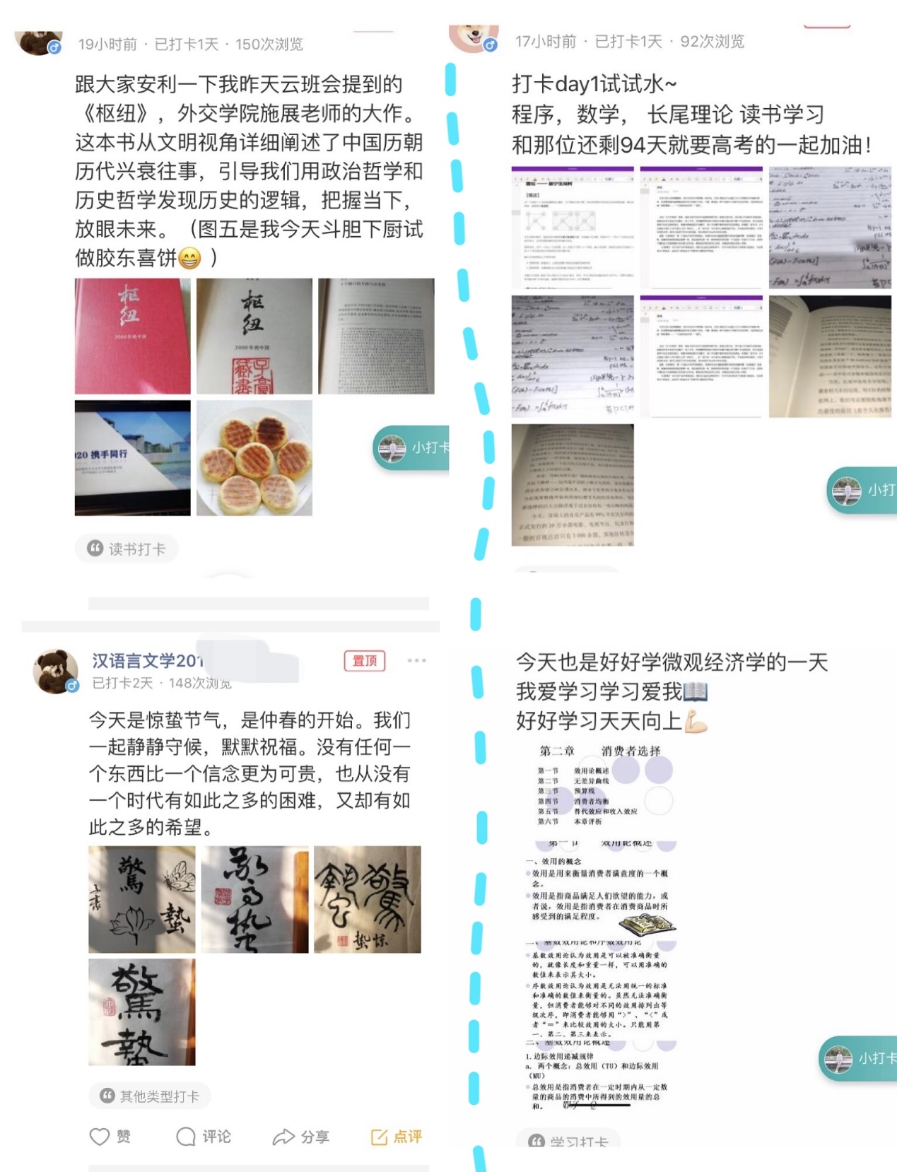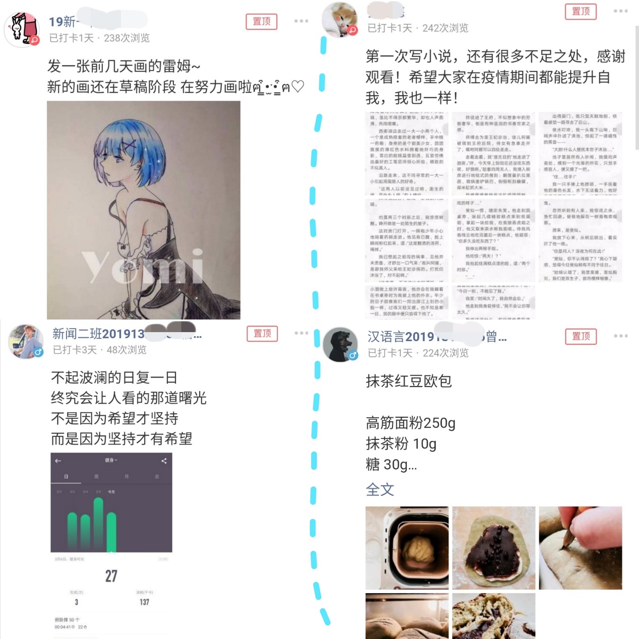 此次打卡活动共有七大模块:防疫打卡、学习打卡、文学创作打卡、读书打卡、美食打卡、运动打卡、其他类型打卡。在防疫打卡中,同学们纷纷晒出"区块链疫情监测系统"的打卡情况、居家消毒、戴口罩的场景,展现了自我防疫的热情与保护自己、保护他人的决心;在学习打卡中,我们能感受到同学们上网课、背单词、学语言、备考计算机二级的认真状态,“停课不停学”的热情感染着每个人;在其他模块中,同学们更是将自己阅读的感悟、制作的美食、创作的小说及影评等原创内容进行了分享与交流。此外,我们不仅领略到了新疆早上八点半的天空、黑龙江独特的雪景,还欣赏了隽永洒脱的书法作品、美妙动听的吉他弹奏,可谓各领风骚,令人大饱眼福。