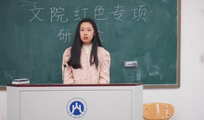 首先,徐一帅同学上台分享。她讲述了团队拜访老党员的经历。老党员们表达出了对我院学子传承弘扬红色文化的肯定。她的团队在不断地研讨、改稿、修缮中,收获了丰厚的经验,并不断成长。