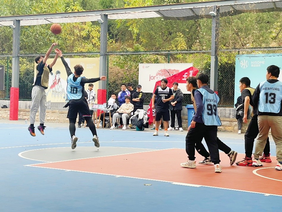哨声响起,冠军角逐赛正式开始,双方队员立刻全身心投入其中。在上半场比赛中,文化产业管理二班的王福率先抢到球做出进攻,连进两球赢得场外呼声不断。在距离上半场还有30秒结束的关键时刻,新闻学二班的尼加提精准投进一记三分球,使上半场呈15:7的悬殊差距。