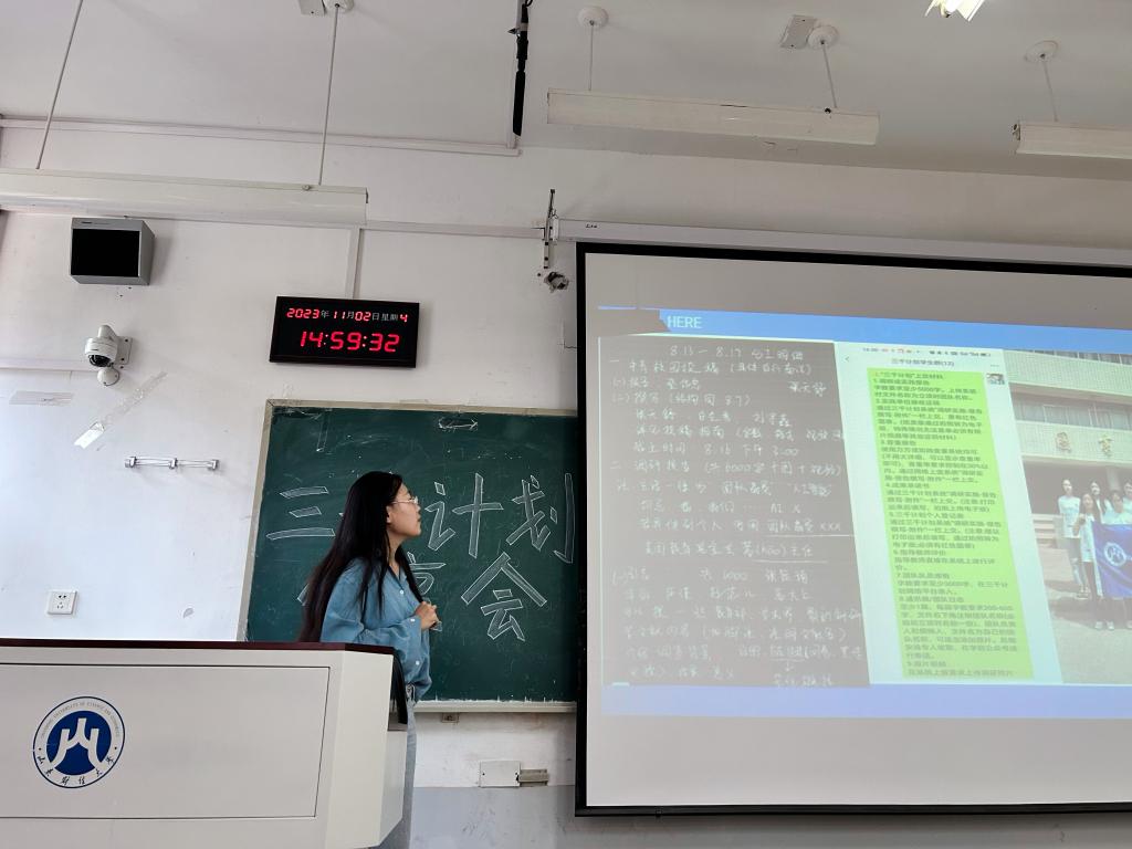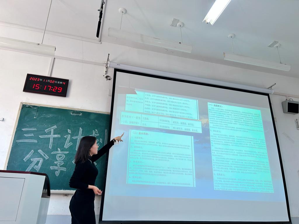 11月2日下午,我院成功举办三千计划分享会。会议由23级文化产业管理二班的刘亦菲主持,21级优秀学生代表分享活动经验,23级汉语言文学全体学生参会。