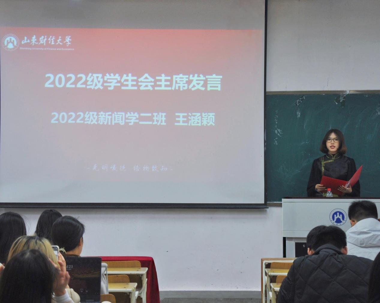 2022届学生会主席王涵颖代表新一届学生会成员发言。她回顾了过去几年学生会在各项活动中的成就,分享了在学生会工作中的成长与收获。她鼓励新一届学生会干事们以“服务同学、提高自我、奉献学院”为宗旨,以“团结、务实、创新、高效”为工作原则,为学院发展贡献青春力量。