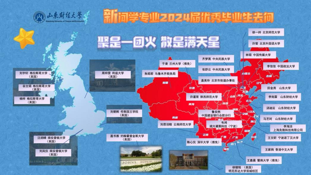目前山东财经大学新闻与传播专业硕士尚未有毕业生,但就学生实习安排看,学生通过专业联合培养基地、专业实践基地、自主实习等形式进入山东文旅传媒集团、舜风传媒、大众网、山东出版集团、21财经等知名企业。