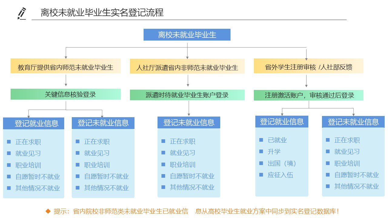 业务介绍:实现山东户籍离校未就业毕业生实名登记功能,登记就业、升学、出国(境)、应征入伍以及未就业毕业生服务需求信息。 包括省内院校非师范毕业生、省内院校师范类毕业生和省外院校毕业生三类。