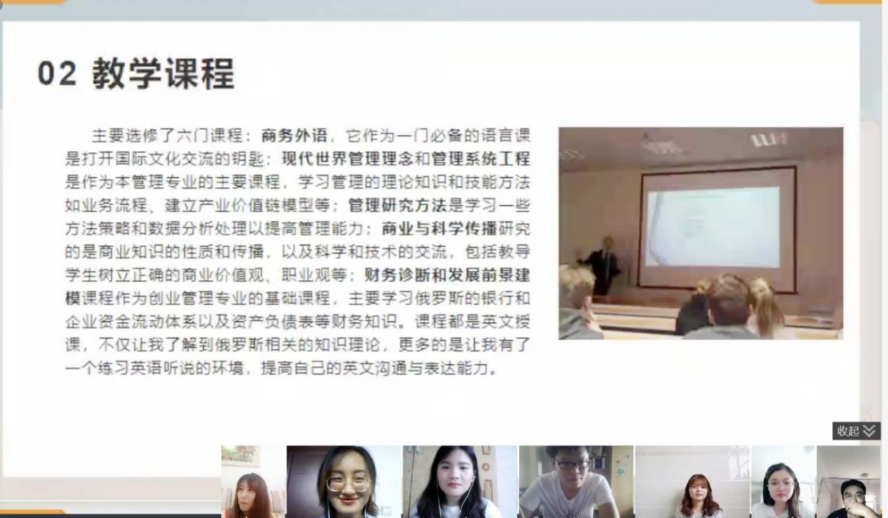 我院2018级硕士研究生李巧雯和朱蚊锐于2019年9月10日-2020年1月20日参加了我校赴俄罗斯普列汉诺夫经济大学的研修交流项目。2020年6月2日下午,两位同学采用网络视频会议的形式分别向我院各位研究生同学做了此次访学经历的交流与分享。