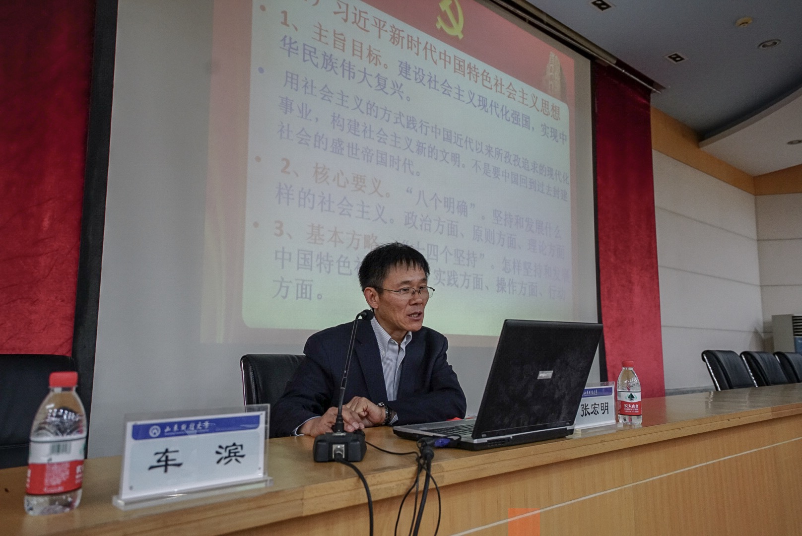 车滨要求,当前和今后一个时期,党委宣传部要围绕贯彻落实全国宣传思想工作会议和全国教育大会精神,精心策划,主动对接宣讲专家,开展好丰富多样的宣讲活动,努力推进党的创新理论大众化,为学校改革发展营造良好的舆论氛围。广大教师要结合学科建设和科学研究实际,夯实立德树人、教书育人的责任感使命感,以“四有好老师”为事业追求,自觉坚持马克思主义在我国哲学社会科学领域的指导地位,为建设具有中国特色、中国风格、中国气派的哲学社会科学做出应有的贡献。同学们要积极践行习近平总书记对青年提出的“爱国、励志、求真、力行”的新要求,勇做新时代的奋进者、开拓者,为建设社会主义文化强国贡献自己的力量。