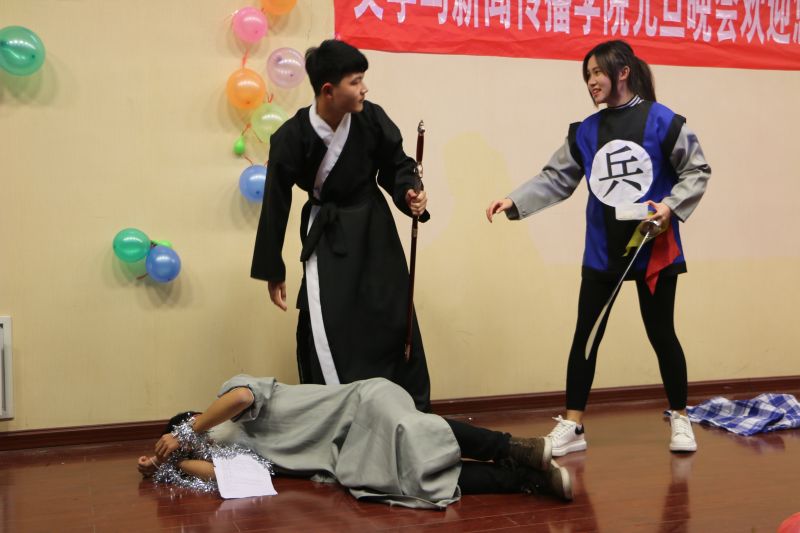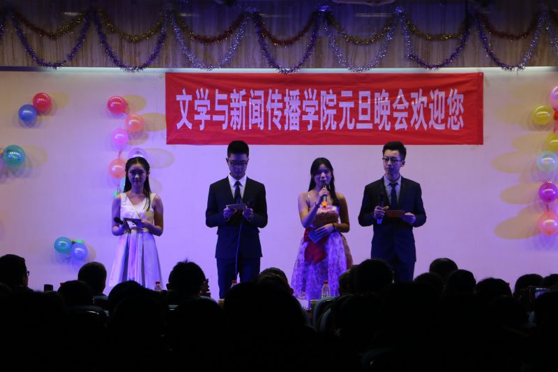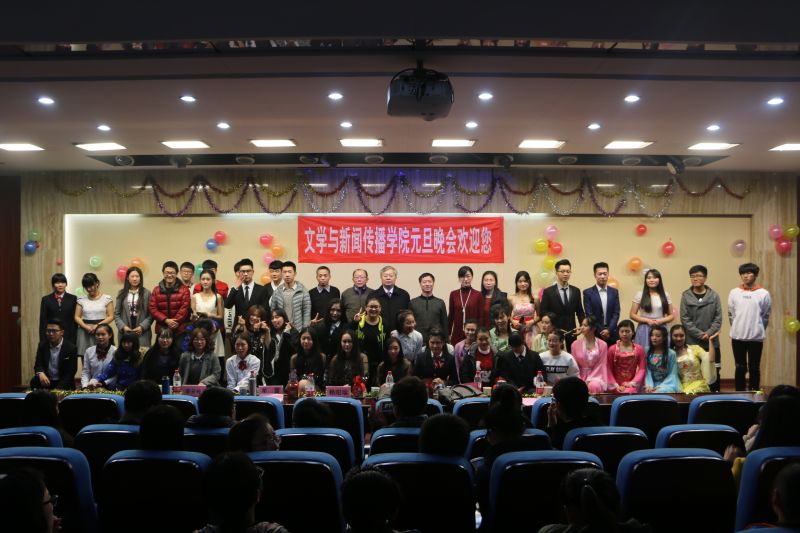 2015年1月23日晚六点二十,文学与新闻传播学院迎新晚会暨元旦晚会在敏行楼101室举行。院长孙玉太教授,党委书记赖昭瑞教授,党委副书记董瑞华,副院长牟雷副教授,学院团委书记李开传,就业办主任李霞老师出席了晚会,同时各学院学生会代表也受邀参加晚会并与文院全体同学一起观看演出,共庆节日。