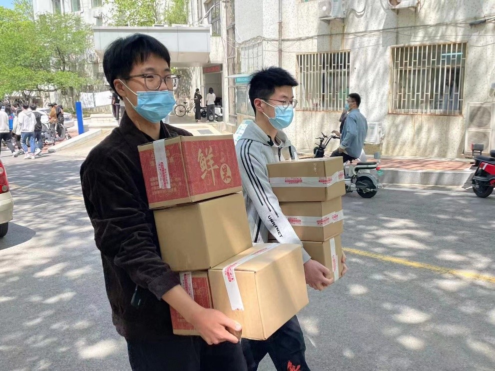 4月16日上午11:00,装载着一箱箱苹果的货车驶入校园。等候在一旁的志愿者们马上对苹果进行卸车,以班级为单位、按照在校学生每人5斤发放。各班班团组织人员进行搬运,将这批苹果送至每位同学手中。