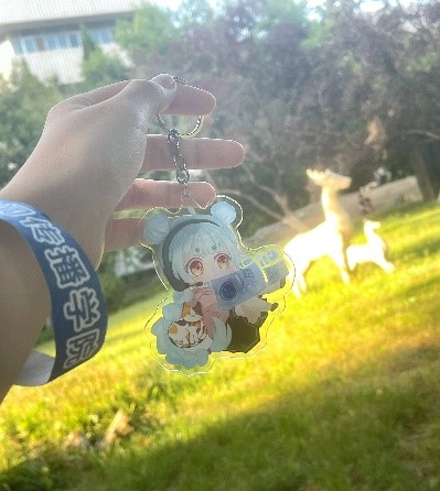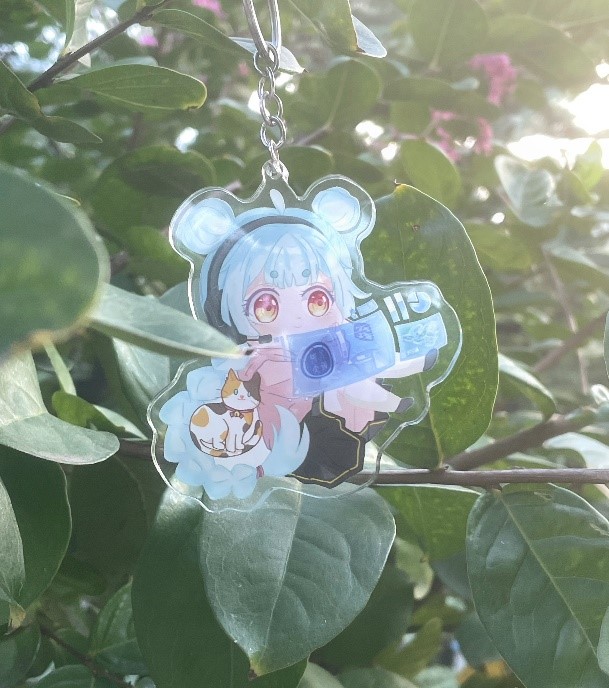 钥匙扣由2020级汉语言文学一班的赵曼卓同学设计绘制,图案主体是代表学院的人物形象“阿文”。钥匙扣的设计在阿文的基础形象上,添加了耳机、电子屏幕等充满科技感的元素,并与文学与新闻传播学院的标志性logo相结合。“阿文”一改往日形象,头戴耳机、手握显示舜耕校区地图和“财大文院”徽章的电子屏,旁边还有一只舜耕校区随处可见的小猫咪,创意十足。