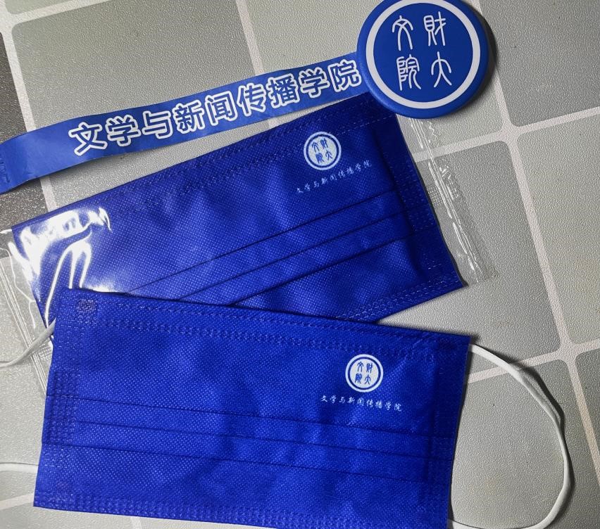 为配合疫情防控,大家仍然要做好个人防护,学院贴心地为大家准备了带有象征学院标志的口罩,以蓝色为底,点缀着文学与新闻传播学院的文字与标志,简约大气又不失创意。在如今的疫情防控工作下,戴上口罩,接受这份学院限定的温暖。徽章与腕带采用同款设计,相互映衬,观赏性与实用性同时具备。