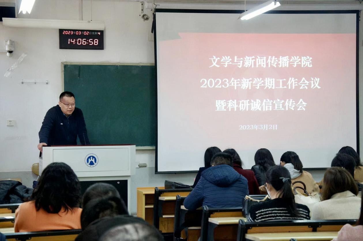 为推进学院新学期可持续高质量发展,规范学术行为,营造风清气正的学术环境,3月2日下午,我院于1307教室召开2023年新学期工作会议暨科研诚信宣传会。学院党委书记杜啸尘、副院长李军红、副书记王恩娟、副院长王丽霞出席会议,全体教职工参加会议。