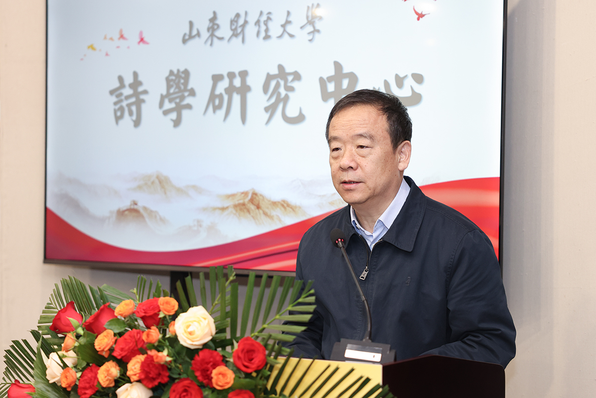 赵艺丁在致辞中对诗学研究中心的成立表示热烈的祝贺,认为这是山东财经大学为传承中华文化、推动文化繁荣所做的一件大事、好事,也是全省文学界非常值得庆贺的一件大事、喜事。他在回顾了山东自古以来的优良文学传统、阐述了当代山东文学以及山东诗坛的创作盛况后,祝愿我校诗学研究中心在今后的诗学创作和研究中,扎根齐鲁文化沃土,赓续历史文脉,谱写当代华章,开展多层次、全方位的文学艺术创作及理论研究,把诗学研究中心打造成为国内独具特色、实力雄厚的诗学文化研究基地,为推进文化强省建设、打造中华民族现代文明高地做出积极贡献。