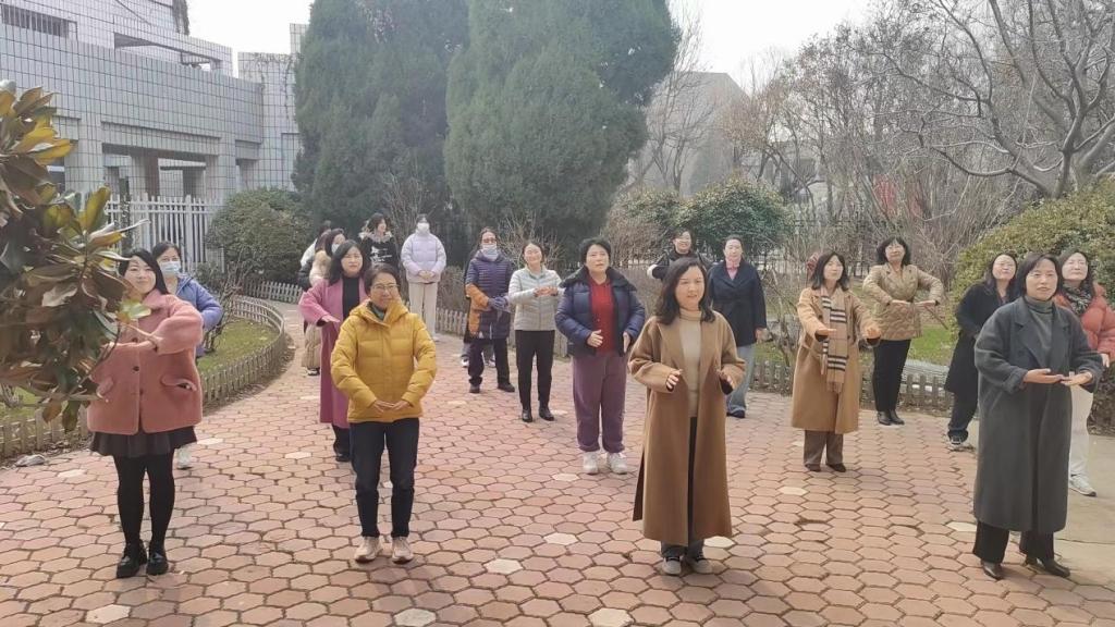 随后,女教职工们在室外进行了八段锦学习,在打八段锦的过程中,老师们精神抖擞、舒展优美,健美的身姿在舜耕校园形成一道亮丽的风景线。