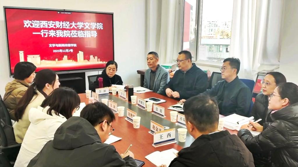为深化新文科建设合作、共探人才培养创新路径,12月2日上午,西安财经大学文学院一行来我院开展专题交流研讨。西安财经大学文学院院长张颖,我院党委书记杜啸尘,院长张超出席会议。