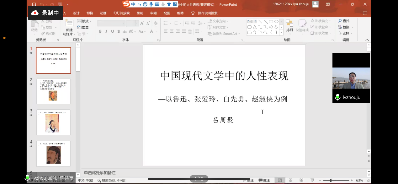 11月10日下午,我院成功举办了题为《中国现当代文学中的人性表现——以鲁迅、张爱玲、白先勇、赵淑侠为例》的学术讲座。本次讲座邀请青岛大学教授吕周聚主讲,由院长孙丽君主持。中文系系主任史卉、副主任亓凤珍、中国现当代文学专业教师温凤霞、谢海平以及线上线下师生共150余人聆听了本次讲座。