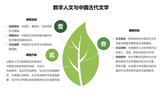 “数字人文与中国古代文学”是汉语言文学专业培养方案中“数字人文”模块方向的一门专业选修课,向学生全面展示数字人文与古代文学研究的新视域,使其形成明确的守正出新意识。课程内容主要有:数字人文与传统范式关系探讨,数字人文与传统文献学的现代转型,数字人文与古代作家研究,数字人文与古代作品研究,数字人文与古代文学思潮研究,数字人文与明清小说研究,数字人文在文学地理学中的实践突破,数字人文对古代文学理论研究的推进衍生等。