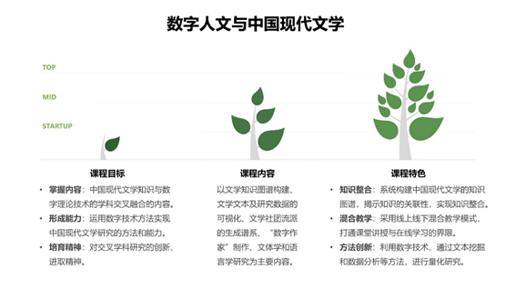 “数字人文与中国现代文学”是汉语言文学专业培养方案中“数字人文”模块方向的一门专业选修课,以文学知识图谱构建、文学文本及研究数据的可视化、文学社团流派的生成谱系、“数字作家”制作、文体学和语言学研究为主要内容,注重理论学习与实践运用相结合,提升学生利用数字技术开展现代文学学科研究的能力。