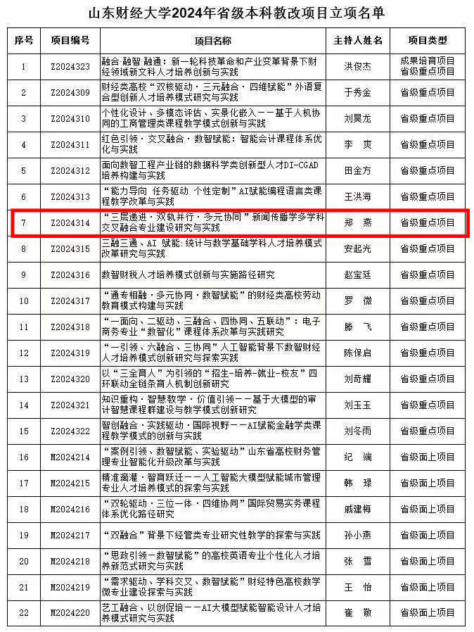 近日,山东省教育厅公布了2024年本科教学改革研究项目立项名单,我院郑燕老师主持的《“三层递进·双轨并行·多元协同”新闻传播学多学科交叉融合专业建设研究与实践》项目成功获批重点项目立项。
