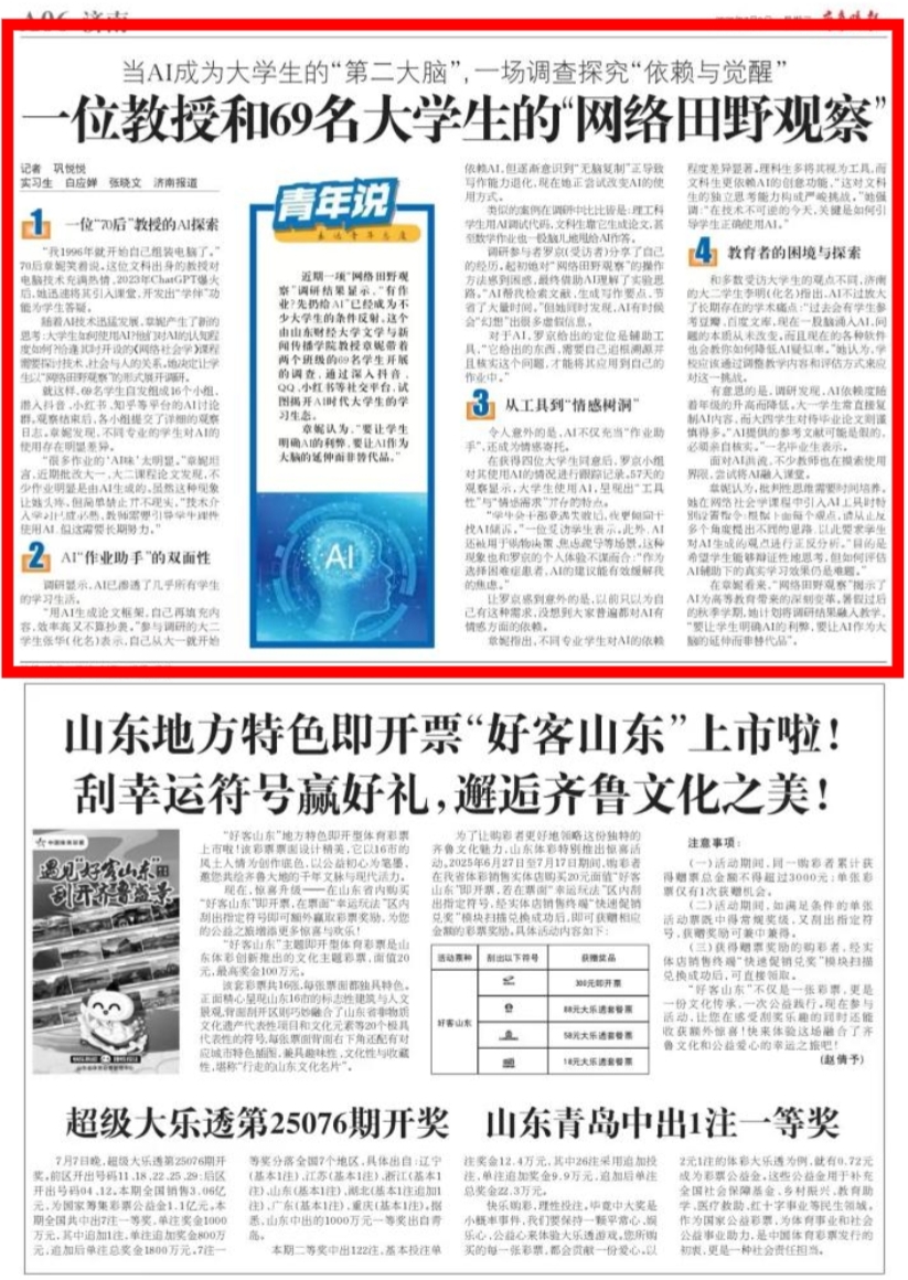 近日,我院章妮教授发起的“网络田野观察”教学改革实践活动被《齐鲁晚报》报道。该活动深入探讨了AI时代大学生的学习生态,引起社会各界广泛关注。