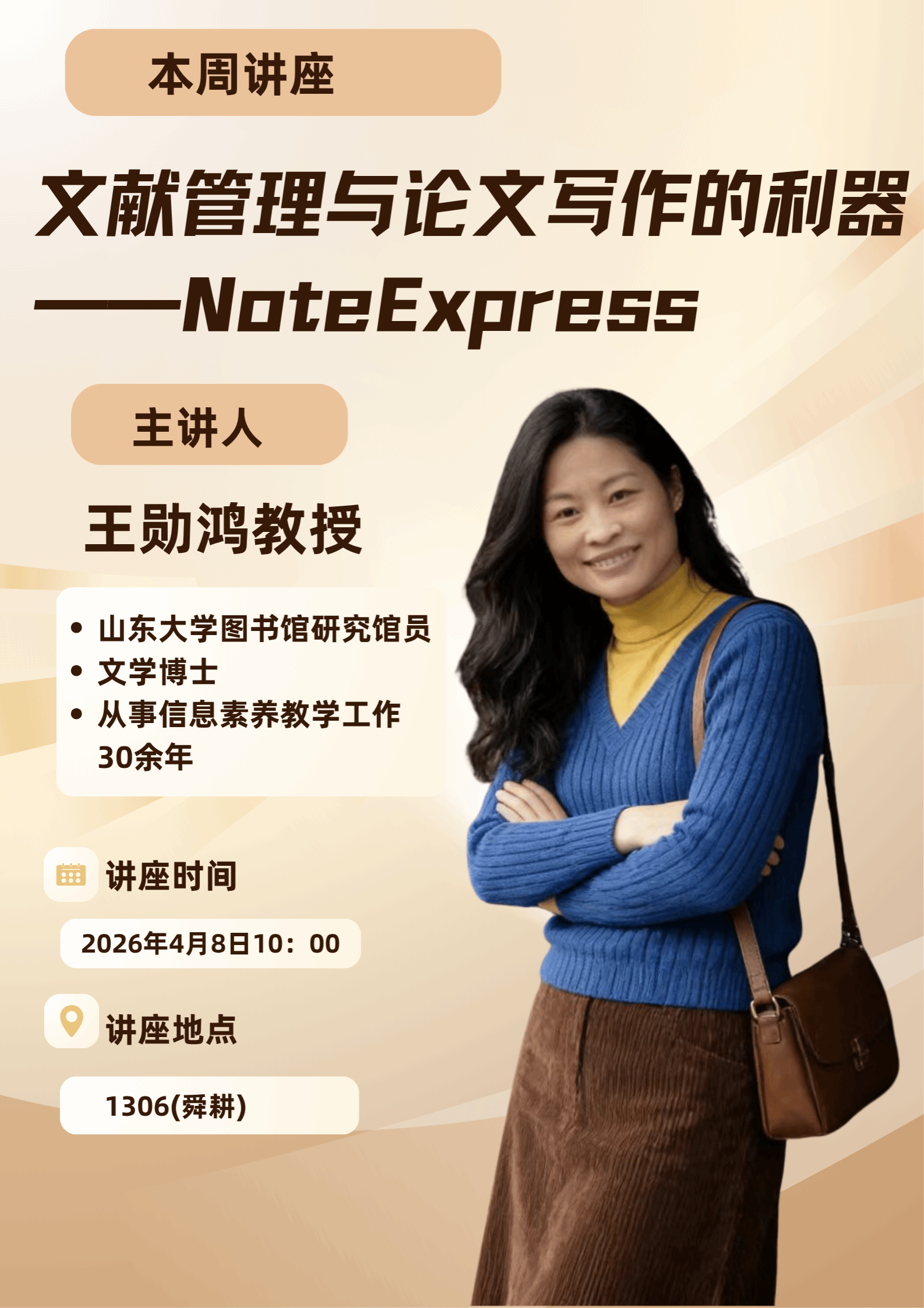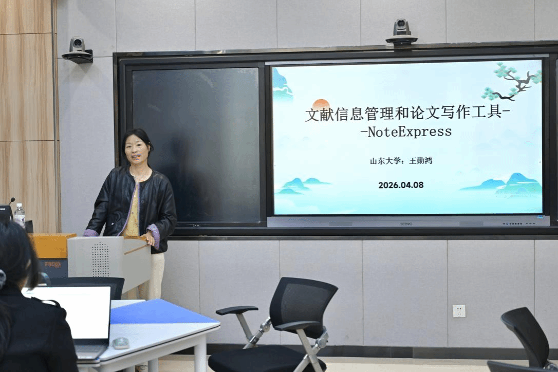4月8日,山东大学图书馆研究馆员、文学博士王勋鸿教授应邀做客山东财经大学文学与新闻传播学院,开展题为《文献管理与论文写作的利器——NoteExpress》的专题讲座。本次讲座由章妮教授主持,2025级新闻与传播专硕班全体同学参加,旨在助力学生夯实学术研究基础,提升文献处理与论文写作核心能力。
