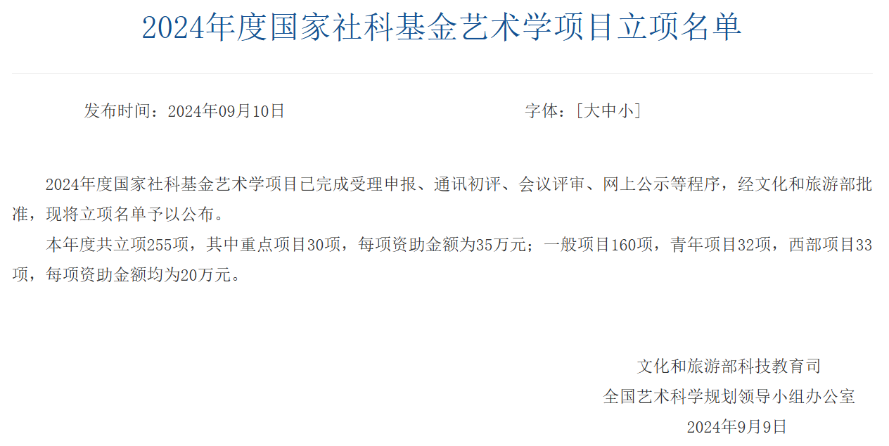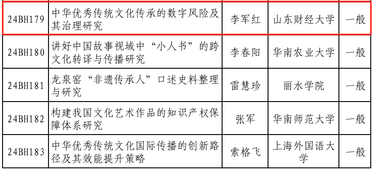 9月9日,2024年度国家社科基金艺术学项目立项名单发布,我院李军红教授团队申报的《中华优秀传统文化传承的数字风险及其治理研究》获批一般项目立项。